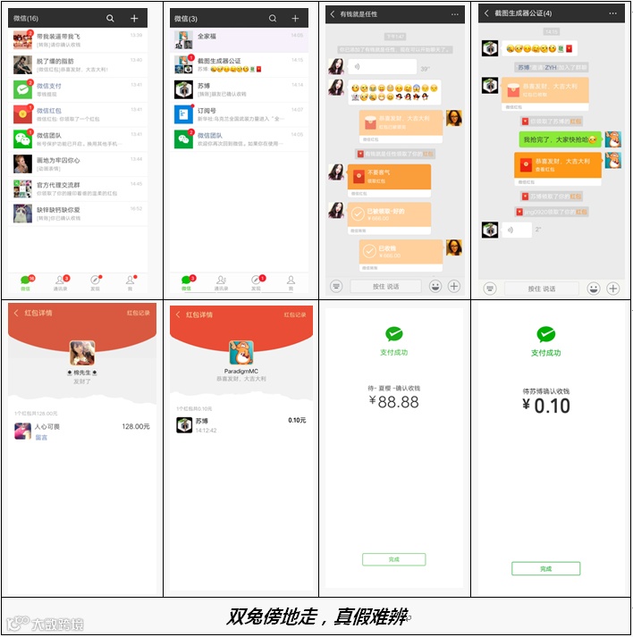1、收集复制微信界面美术素材,集成于被诉截图生成器中,并专门针对微信主界面、聊天界面、红包界面、支付界面、账单界面等制作专门的生成模块,通过调用上述素材生成与真实微信界面相同或高度相似的微信界面截图;