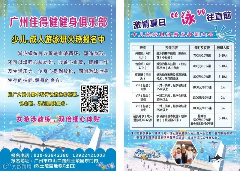 导读:成人游泳班会员惊爆价500元/10节课(包学会)成人·少儿游泳私教班1对3 1000元/10节课(包学会)1