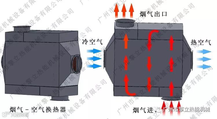 解决问题:降低排烟口温度,减少片区白雾现象,利用烟气-空气热交换原理,加热新风产出热风,可用厂房供暖等用途,且节能环保。