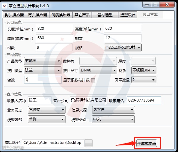 6个参数,可选择填写5种参数也可以自动计算结果,填好之后点击生成选型截图,即可出来设备外形尺寸、换热管根数与排数,再根据实际需要接口大小,风罩数量,材质填写,点击生成成本表,如下图所示:
