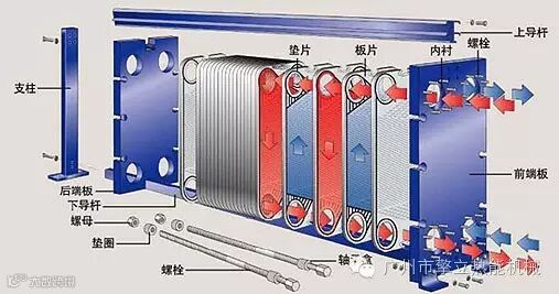 板式换热器是由带一定波纹形状的金属板片叠装而成的新型高效换热器,构造包括垫片、压紧板(活动端板、固定端板)和框架(上、下导杆,前支柱)组成,板片之间由密封垫片进行密封并导流,分隔出冷/热两个流体通道,冷/热换热介质分别在各自通道流过,与相隔的板片进行热量交换,以达到用户所需温度。