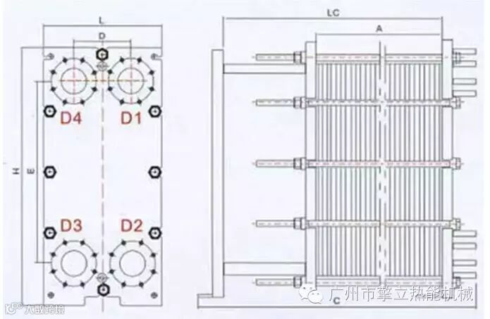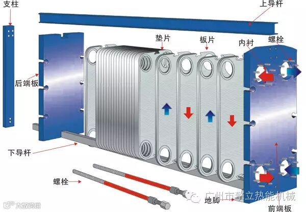 板式换热器是将板片以叠加的形式装在固定压紧板、活动压紧板中间,然后用夹紧螺栓夹紧而成。