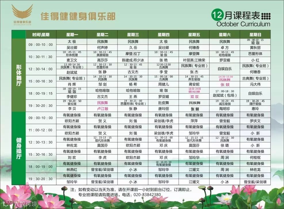 周三 19:30-20:30 王琴(古典舞)改为:卢江敏(民族舞);周五18:00-19:00 李贝(普拉提)改为:双双(普拉提);周六 14:30-15:30 林荣平(民族舞)改为:张燚(民族舞)