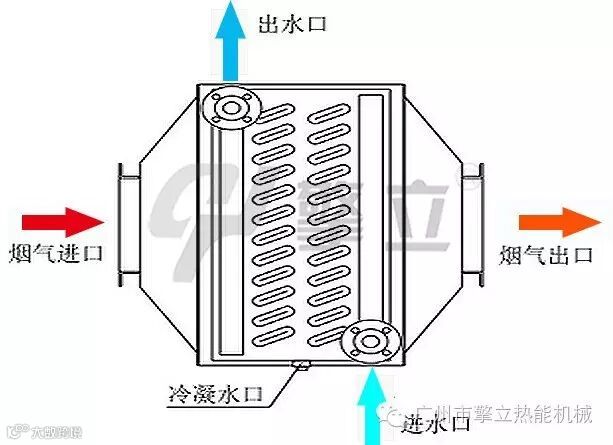 翅片管余热回收器是燃煤、油、气锅炉专用设备,安装在锅炉烟口,回收烟气余热加热生活用水或锅炉补水。其构造如图所示:左部是进气烟道,右部为出气烟道,中间管道内走水。有进水口和出水口。工作时,烟气流经翅片管余热回收器,翅片管吸热后将热量转化到水,将水加热。为了防止堵灰和腐蚀,擎立节能器有设计专门清洗口和冷凝水排口,另余热回收器出口烟气温度一般控制在露点以上,即燃油、燃煤锅炉排烟温度≮130℃,燃气锅炉排烟温度≮100℃,节约燃料4-18%。