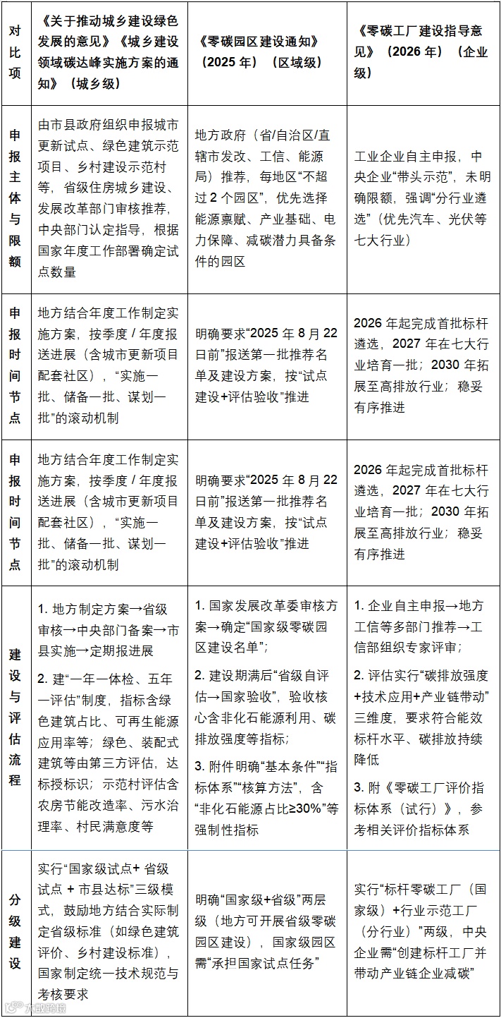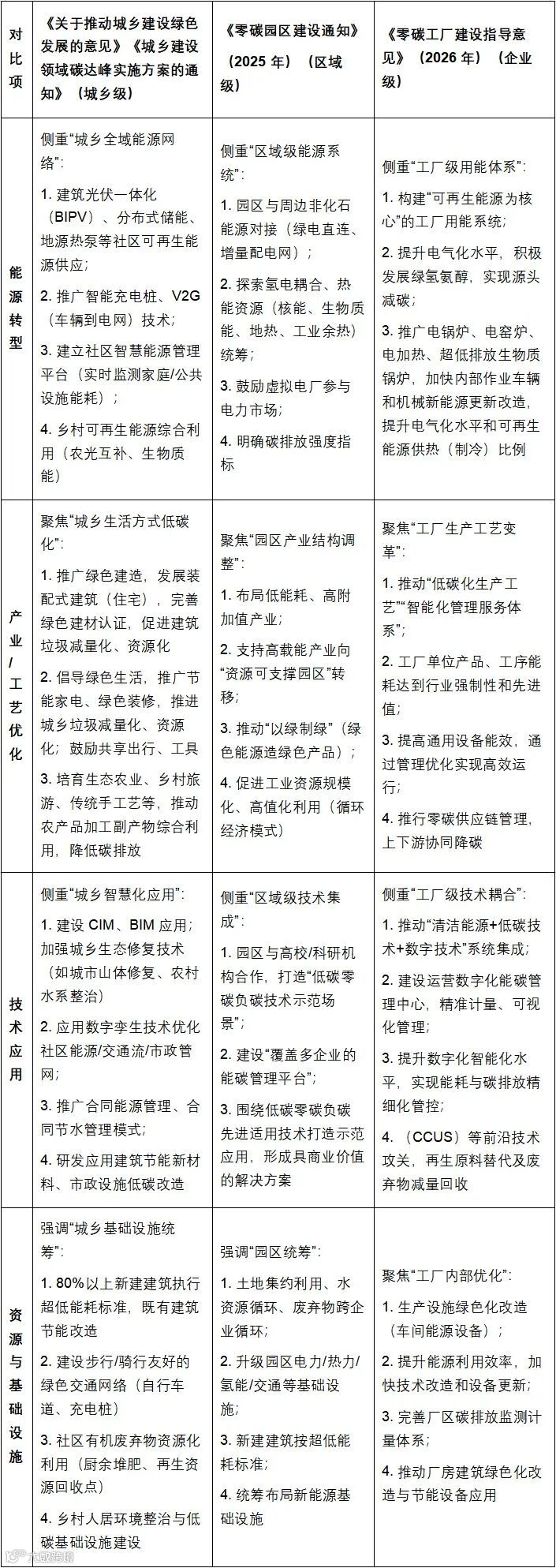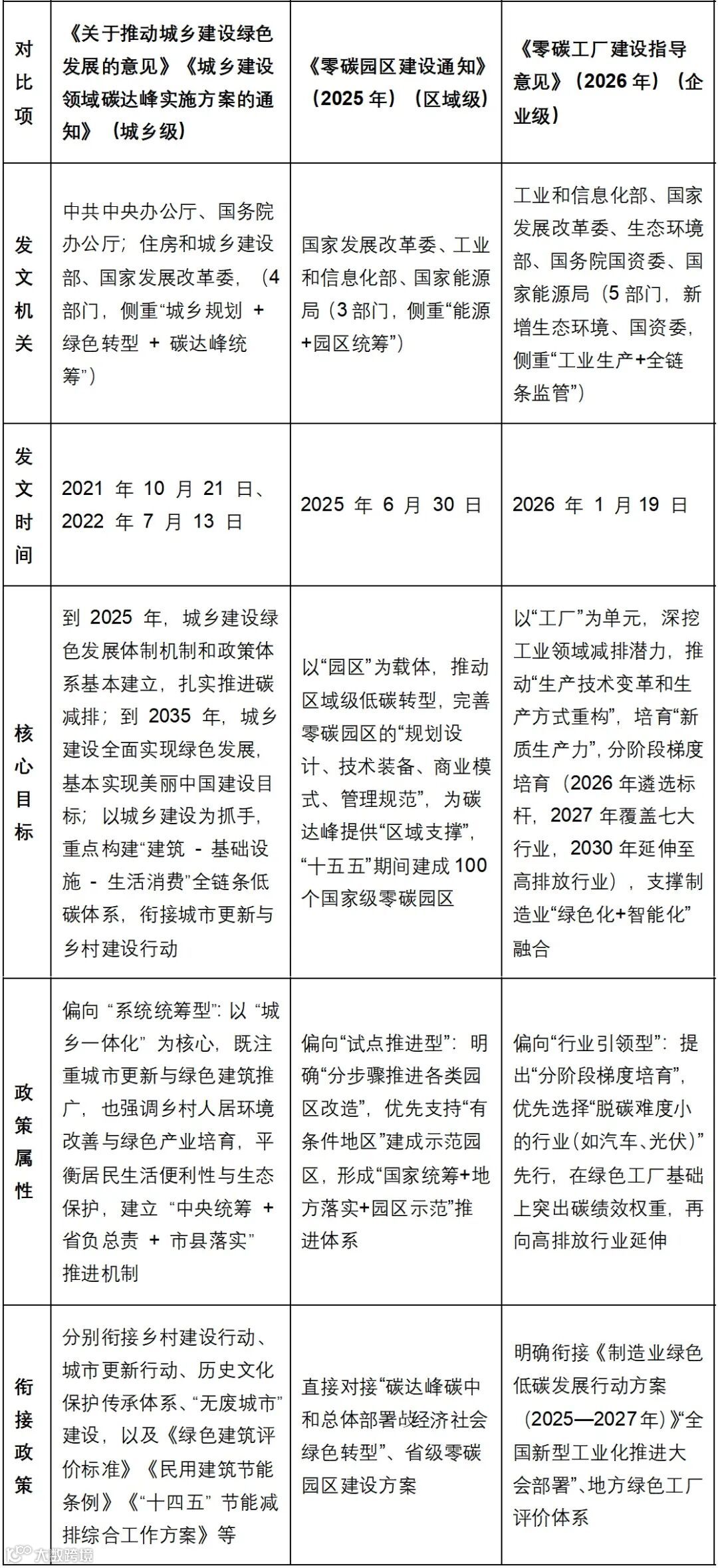 零碳转型是应对全球气候变化、实现我国 “双碳” 战略目标的核心路径,也是推动经济社会绿色高质量发展、培育新质生产力的关键抓手。为系统把握中国零碳转型政策指引,本文将中共中央办公厅、国务院办公厅印发《关于推动城乡建设绿色发展的意见》、住房和城乡建设部、国家发展改革委《城乡建设领域碳达峰实施方案的通知》(建标〔2022〕53号)等零(低)碳城乡政策,以及《关于开展零碳园区建设的通知》(发改环资〔2025〕910号)、《关于开展零碳工厂建设工作的指导意见》(工信部联节﹝2026﹞13号)等相关政策置于统一分析框架,从政策定位、覆盖范围、核心任务、报建流程、要素保障五大维度展开对比。通过拆解各维度关键子项,可为地方政府、园区、企业及社区主体提供精准的政策落地指引,推动形成“以点带面、全域协同”的零碳发展新格局。