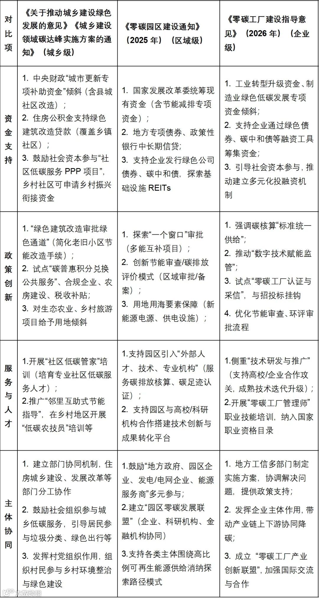 综上,低碳城乡、零碳园区与零碳工厂相关政策虽在适用场景、实施主体与任务重点上各有侧重,但均围绕 “双碳” 目标构建了差异化且互补的政策体系:低碳城乡政策聚焦区域尺度的绿色发展顶层设计,零碳园区政策侧重空间单元的碳减排协同实践,零碳工厂政策则落脚于产业终端的低碳生产转型。通过对五大核心维度的对比拆解可见,各类政策在实施机制上均注重 “目标量化 + 过程管控”,在保障体系上均强化 “政策协同 + 资源支持”,形成了从宏观规划到中观实践再到微观落地的完整政策链条。