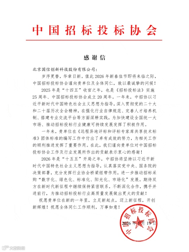岁月不居,天道酬勤。回望2025年,国信国际工程咨询集团股份有限公司与国信招标集团股份有限公司(简称“国信集团”)以专业立身、以诚信致远,在服务国家战略、赋能行业发展、助力地方建设的征程上笃行不怠,收获了来自四面八方的深情回响。一封封感谢信如雪片般纷至沓来,字字句句饱含信任与肯定,共同绘就了国信人这一年最为温暖的底色。