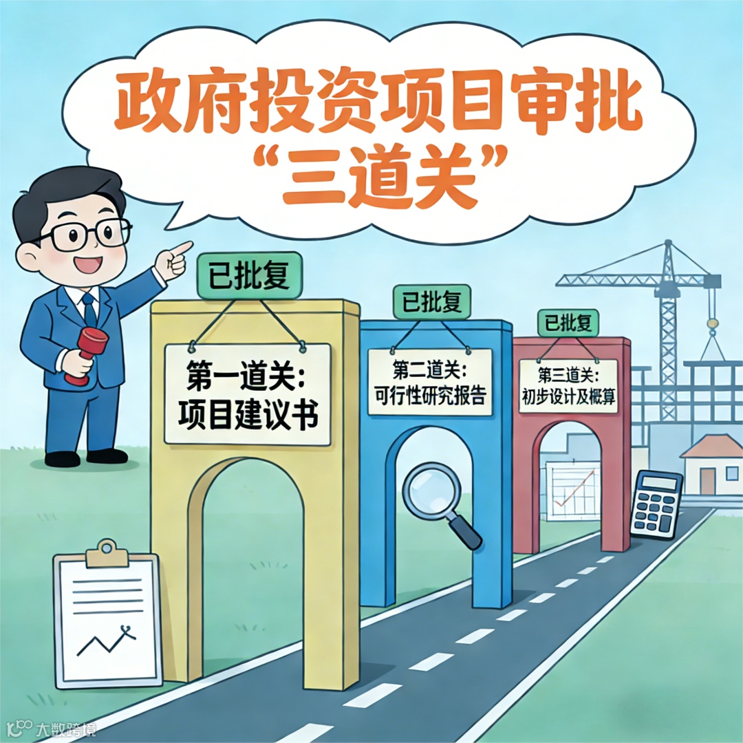 ① 项目建议书 → ② 可行性研究报告 → ③ 初步设计及概算,全部获得批复后,方可开工。