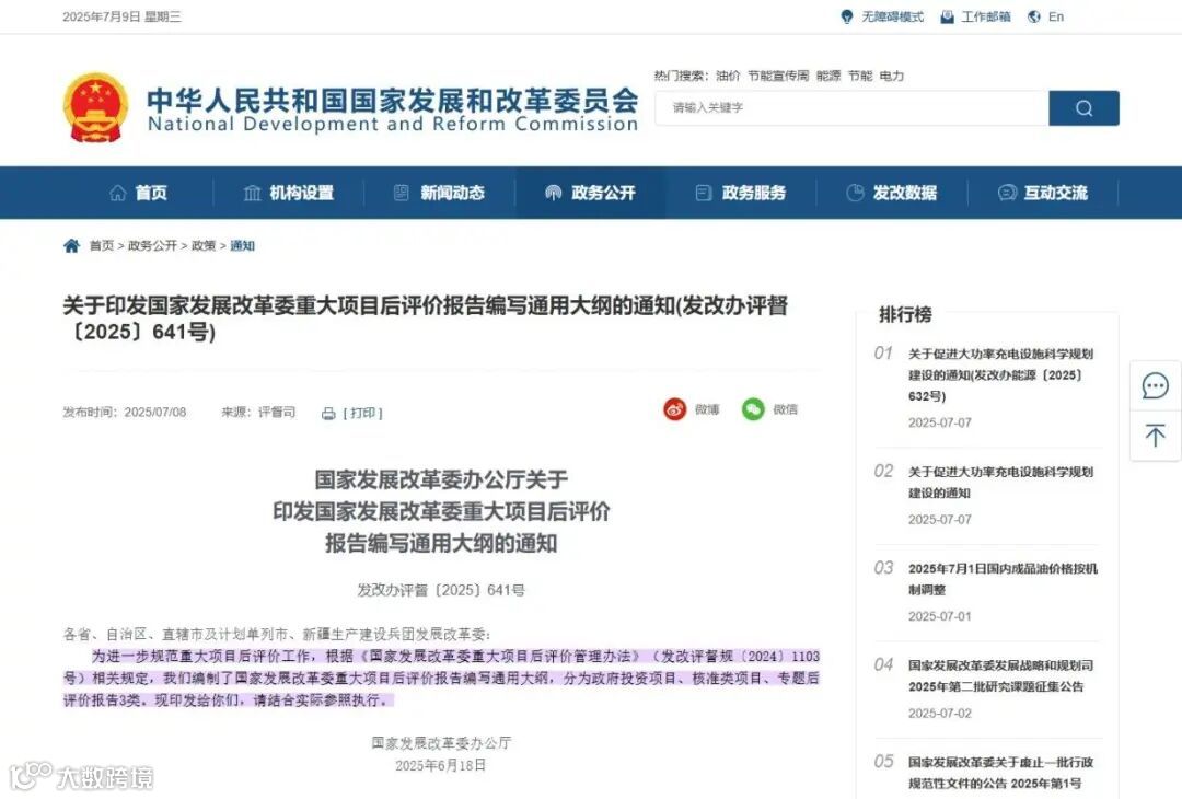 2025年6月18日,国家发展改革委办公厅颁布《关于印发国家发展改革委重大项目后评价报告编写通用大纲的通知》(发改办评督[2025]641号),向社会公布了重大项目后评价报告编写通用大纲。新版后评价报告大纲分为政府投资项目、核准类项目及专题后评价三类,对于全面指导、规范不同类型的后评价报告编制能够发挥重要作用。新版后评价报告大纲与2014年版大纲(《中央政府投资项目后评价报告编制大纲(试行)》)相比,既有继承又有拓展和创新。