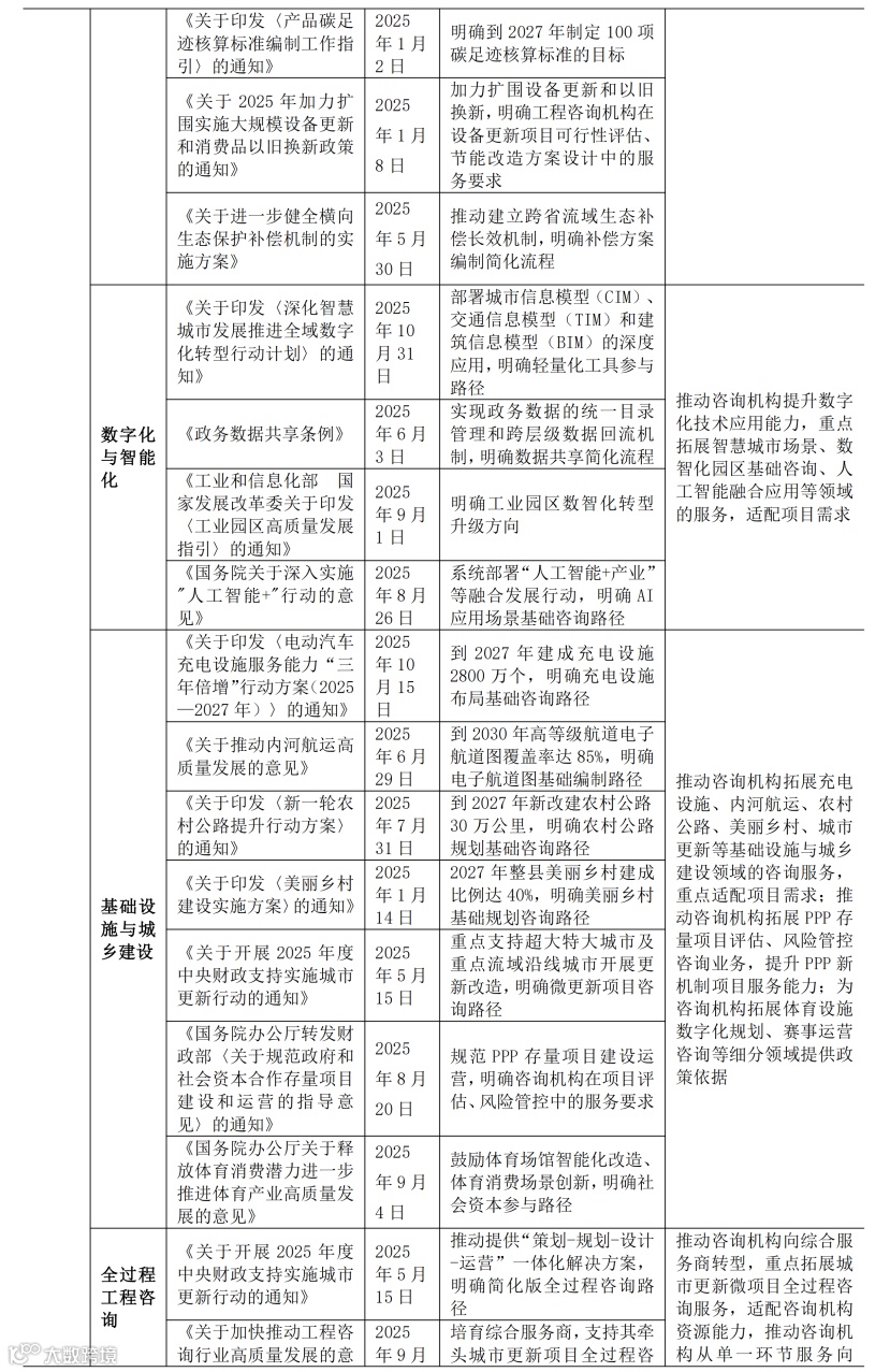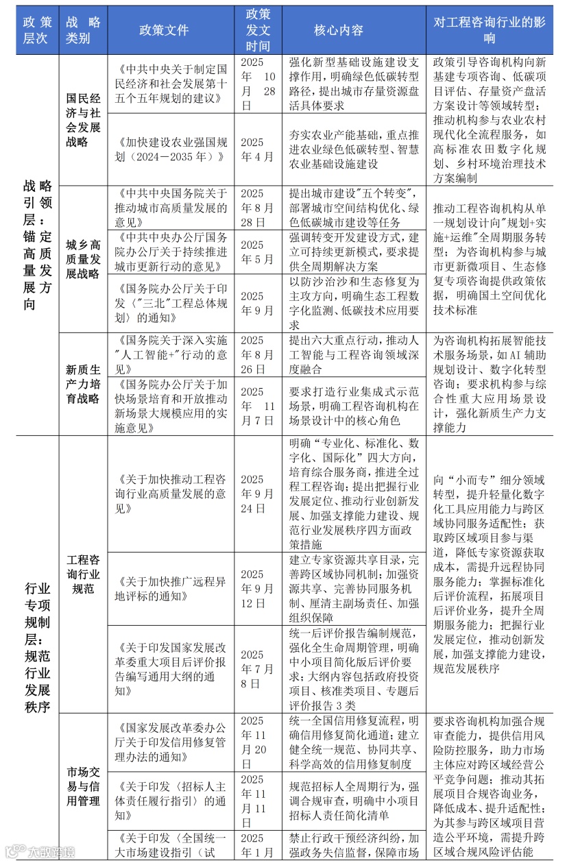 针对此问题,我们整理了一份更详细的《2025 年度涉工程咨询行业重大政策要点汇编》,包含42个核心政策文件,详见文末获取。