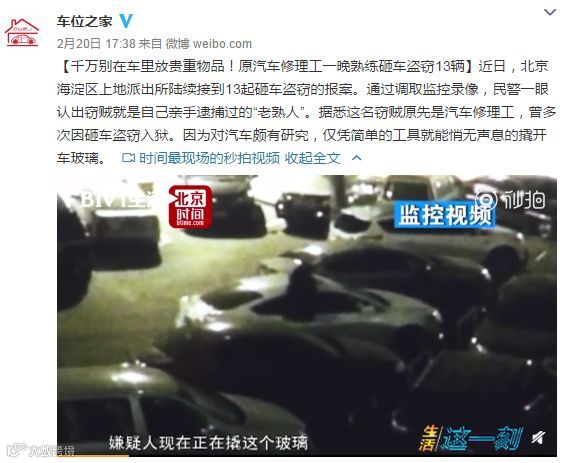 ▐ 【千万别在车里放贵重物品!原汽车修理工一晚熟练砸车盗窃13辆】近日,北京海淀区上地派出所陆续接到13起砸车盗窃的报案。通过调取监控录像,民警一眼认出窃贼就是自己亲手逮捕过的“老熟人”。据悉这名窃贼原先是汽车修理工,曾多次因砸车盗窃入狱。因为对汽车颇有研究,仅凭简单的工具就能悄无声息的撬开车玻璃。