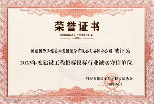 近日,河南省建设工程招标投标协会正式公布了2023年度建设工程招标投标行业诚实守信单位的获奖名单。经过严格的评选程序,国信咨询集团安阳分公司代表集团荣获这一称号。