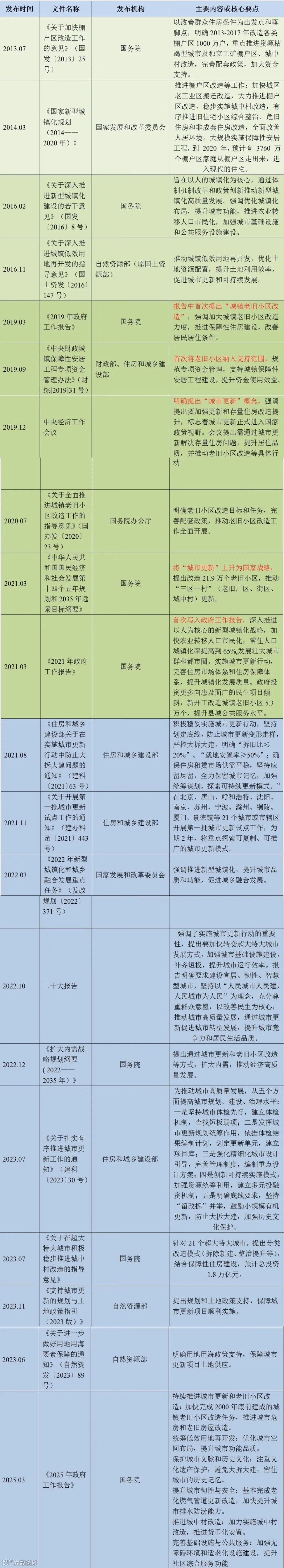 表1系统梳理了2013年以来城市更新的标志性政策文件,完整呈现了从“棚户区改造破局”到“全域更新升级”的演进图谱。