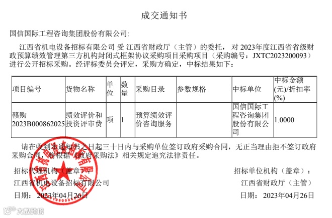 2023年4月,国信国际工程咨询集团股份有限公司(以下简称“国信咨询”)成功入围江西省财政厅2023年度省级财政预算绩效管理第三方机构库,服务期限一年。国信咨询江西分公司将代表集团按照国家有关法律、法规、条例以及有关规范,为省财政厅2023年度省级财政预算绩效管理提供服务。