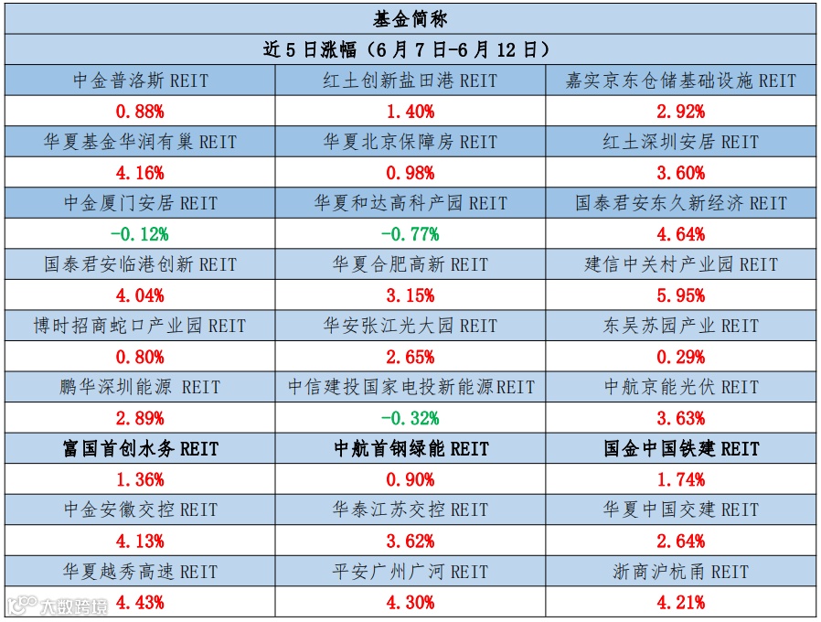 资金端方面,6月2日,博时基金、红土创新基金、中金基金、华安基金四家基金公司发布旗下REITs已完成扩募的公告,公告显示,四只REITs产品合计扩募规模超过50亿元。在公募REITs价格下跌背景下,首批扩募项目依然超额完成募集,让短期资金看到了长期资金的态度,一定程度上给予了投资者更多的信心。此外,部分原始权益人、基金管理人等也陆续加码REITs市场,6月初,中航基金公告对中航京能光伏REIT增持3000万元,建信基金公告将继续增持建信中关村REIT不高于5000万元。此番原始权益人、基金管理人等低位增持护盘行为,彰显了REITs长期投资价值,提振了市场信心。截至6月12日收盘,中证REITs指数较6月6日上涨2.88%,近5日涨幅中,27只已上市REITs中有24只产品涨幅为正,其中建信中关村产业园REIT涨幅接近6%。