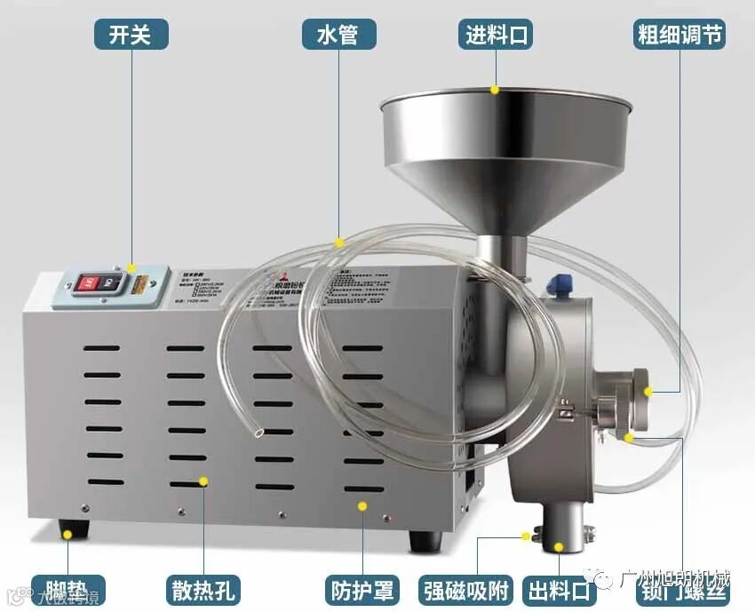 水冷式五谷杂粮磨粉机是在传统的五谷杂粮磨粉机基础上,在其外壁增加水夹层装置,水夹层有进水口和出水口,通过水泵使水在水夹层中流过,从而把腔体内的温度带走。实验表明,该方式对磨粉机的降温效果非常明显。水冷式磨粉机降温,主要表现在: