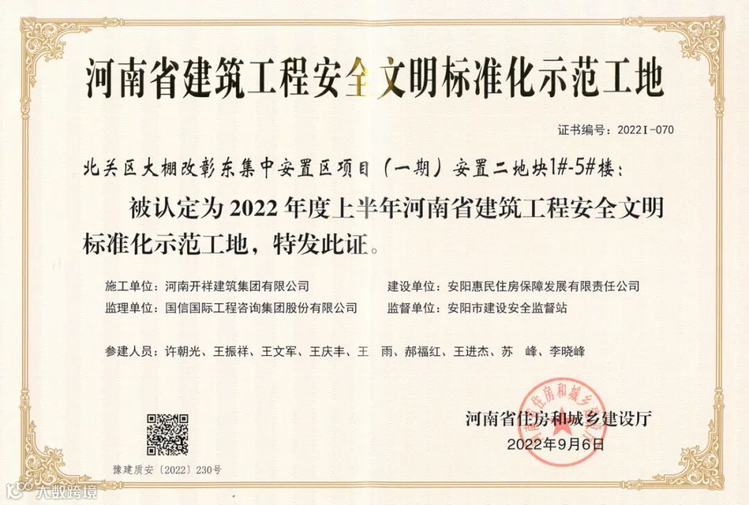 国信国际工程咨询集团荣获2022年度上半年河南省建筑工程安全文明标准化示范工地奖