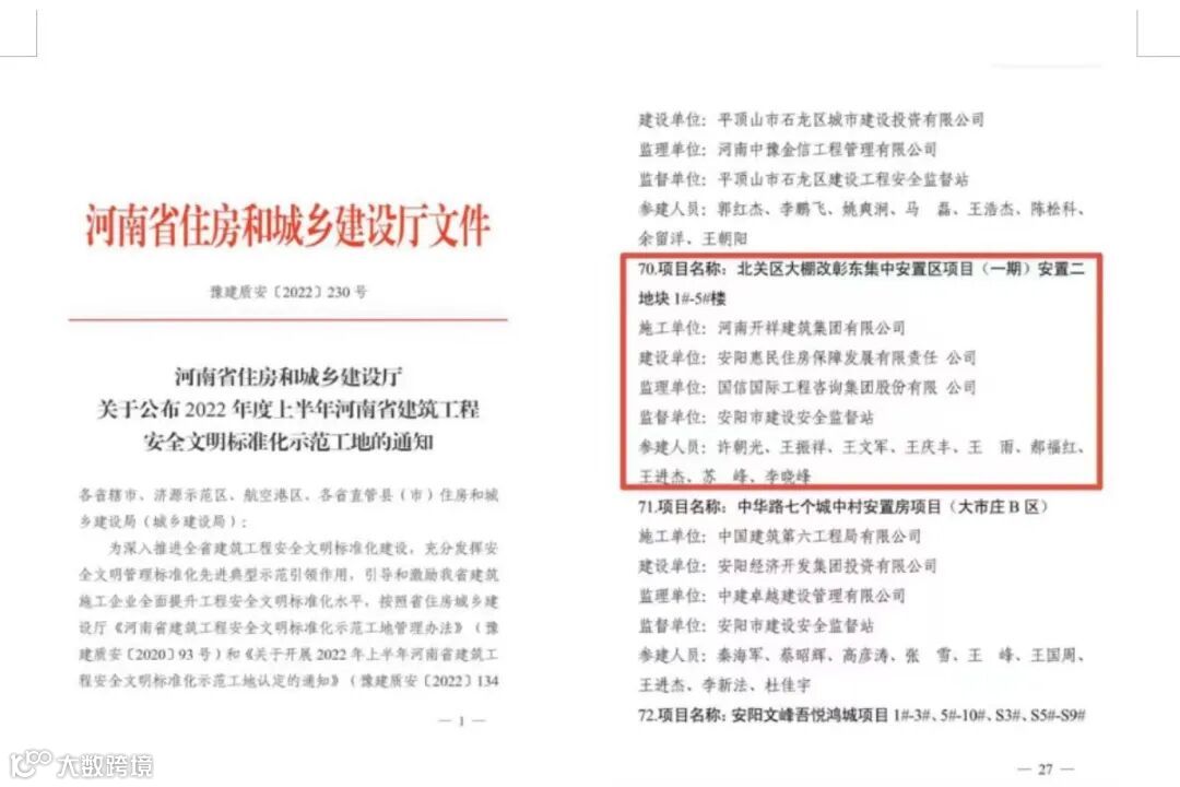 导读:近日,河南省住房和城乡建设厅发布2022年度上半年河南省建筑工程安全文明标准化示范工地的通知。国信咨询安阳分公司代表国信咨询承接的北关区大棚改彰东集中安置区项目(一期)安置二地块1#-5#楼的监理项目
