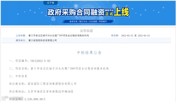 近日,国信国际工程咨询集团股份有限公司(以下简称“国信咨询”)成功中标辽宁省营口市老边区城子污水处理厂PPP项目全过程咨询服务机构。具体服务内容包括但不限于组织项目工艺、规模专家论证及可行性研究报告专家评估;PPP全过程咨询(含绩效考核);社会资本采购;工程造价全过程咨询;工程监理等。