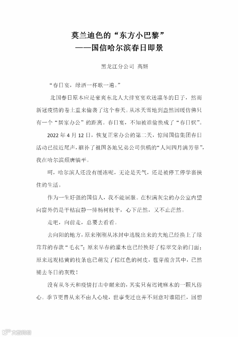 虽然多地疫情突发,但活动还是获得全体国信人的积极响应,无论是在隔离中的国信人,还是已经出门追寻春的脚步的国信人,都用各自的方式记录着2022年这个不寻常的春天。本次活动共收到大江南北国信人提交的103份各种形式的稿件,集团相关领导组成了评选小组,并以盲选的形式评选出优秀摄影作品21幅,文学类作品12篇,还评选出优秀美术、美工作品5幅。我们将这个不寻常的春天定格在了这些作品里,希望通过不同形式的作品,为您留住祖国各地春日的剪影,为您展现祖国各地国信人别样的风采。
