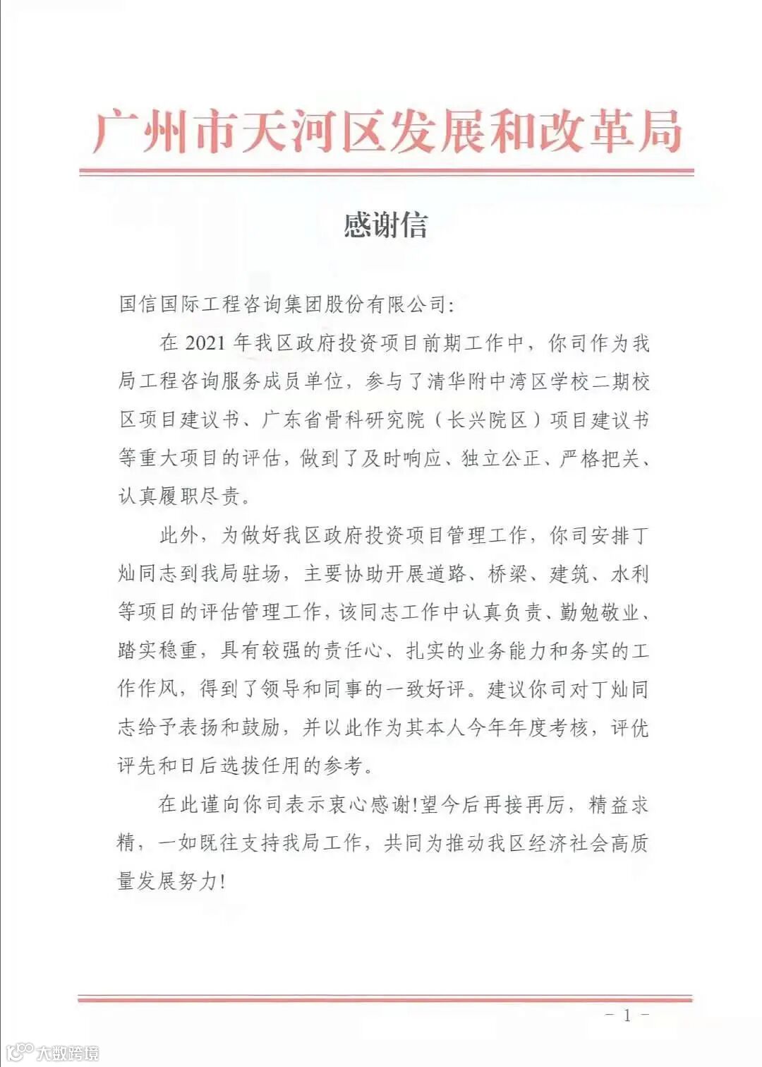 这里有广州市天河区发展和改革局的感谢信,感谢广东分公司在参与政府投资项目前期工作中,做到了及时响应、独立公正、严格把关、认真履职尽责。派驻的项目经理丁灿,在协助开展的道路、桥梁、建筑、水利等项目的评估管理工作中,勤勉敬业、踏实稳重,扎实的业务能力和务实的工作作风得到发改局领导的一致好评。