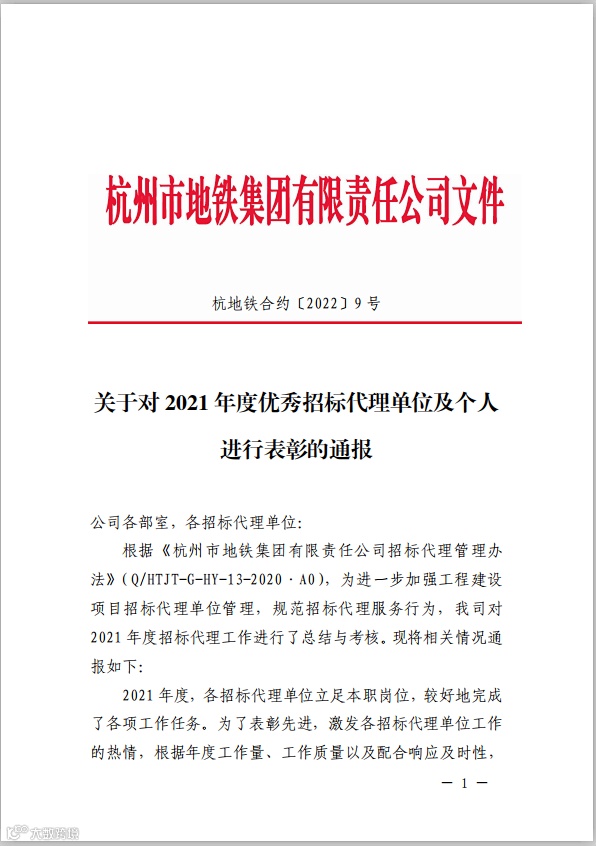 这里还有绍兴市地铁集团寄来的关于对2021年度招标代理单位考核结果的情况通报,地铁集团根据招标代理文件编制质量、服务响应时效、对外协调能力等综合打分,国信招标集团股份有限公司获得优秀招标代理单位称号。