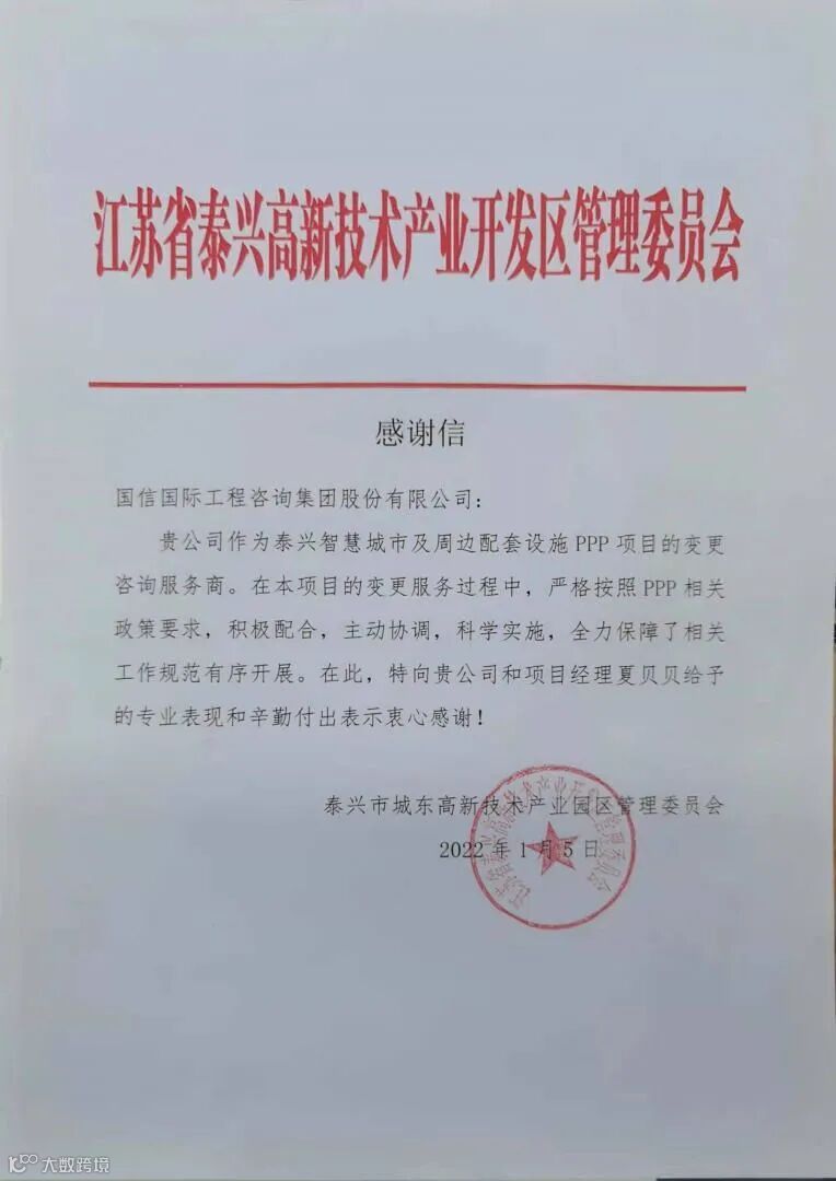这里还有江苏泰兴高新技术产业开发区管理委员会的感谢信,信中对江苏分公司及夏贝贝的专业表现和辛勤付出表示感谢,信中写到,“贵司在咨询服务工作中,严格按照PPP相关政策要求,积极配合,主动协调,科学实施,全力保障了相关工作规范有序的开展”。