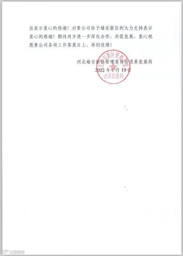 这里有河北雄安新区管理委员会改革发展局寄来的感谢信,信里评价国信作为工程咨询行业的重要力量,积极参与国家重大战略建设,主动担当,为雄安新区建设提供了重要技术支持。特别是选派驻场重大项目办的苏健凌、杨娜两同志,恪尽职守,工作细致,表现出强烈的责任心和事业心,能够顾全大局,任劳任怨,克服工作和家庭困难,表现出强烈的使命担当,在新区重大项目谋划与推进、重大项目审批工作中体现了过硬的专业素养,为新区管委会有力有序的整体工作推进做出了重要贡献。