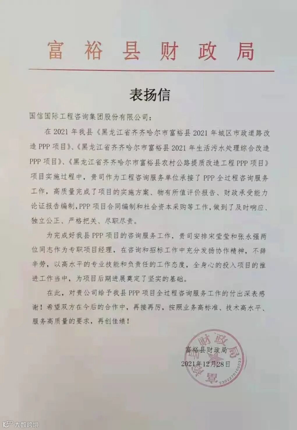 这里有黑龙江省富裕县财政局的表扬信,表扬黑龙江分公司以及宋莹莹和张永强两位项目经理,在承接PPP全过程咨询服务工作时,以高水平的专业技能和负责任的工作态度,完成了该县相关民生系列项目的实施方案、物有所值评价报告、财政承受能力论证报告编制等PPP全过程咨询服务工作,做到了及时响应、独立公正、严格把关,尽职尽责。
