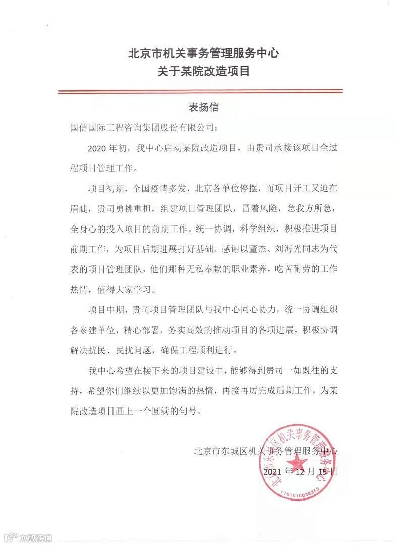 这里有北京机关事务管理中心的表扬信,表扬集团项目管理分公司在疫情多发,北京各单位停摆,而项目开工又迫在眉睫的前提下,统一协调,积极推进项目开展,感谢以董杰、刘海光为代表的项目管理团队敢冒风险,认真负责,那种无私奉献的职业素养,吃苦耐劳的工作热情,值得大家学习。