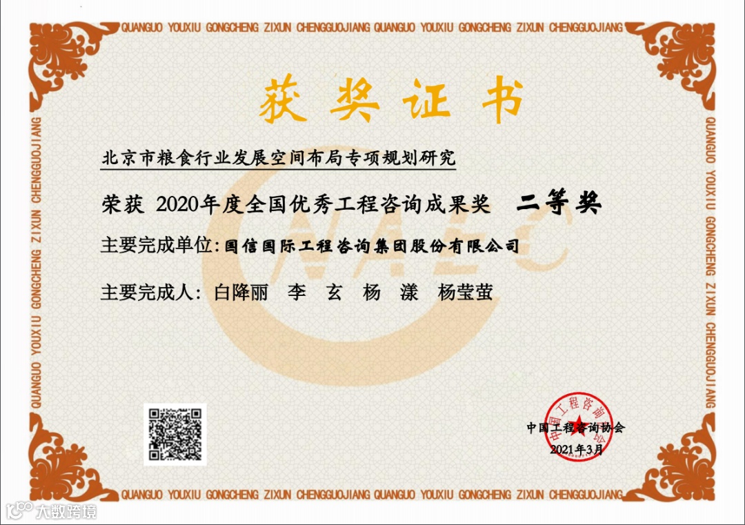《北京市粮食行业发展空间布局专项规划研究》获全国优秀工程咨询成果二等奖、北京市优秀工程咨询成果一等奖;《国家高山滑雪中心、国家雪车雪橇中心及配套设施项目项目建议书(代可行性研究报告)评估》、《北京市城市管理综合执法大数据平台建设项目可行性研究报告》、《北部湾海铁联运皇马现代综合物流园区配套基础设施PPP项目》获北京市优秀工程咨询成果二等奖;《北京市海淀区北部文化中心建设工程后评价》等项目获北京市优秀工程咨询成果三等奖。