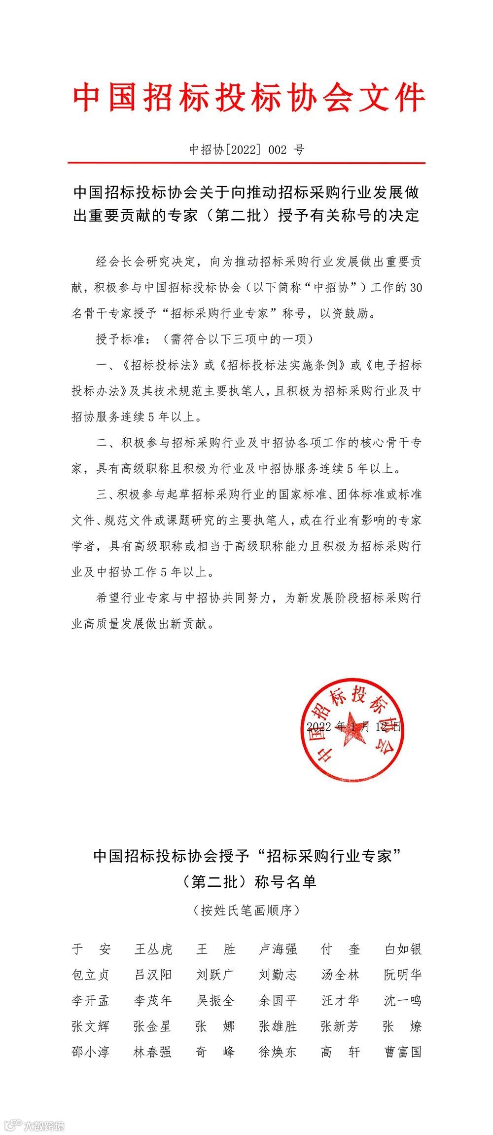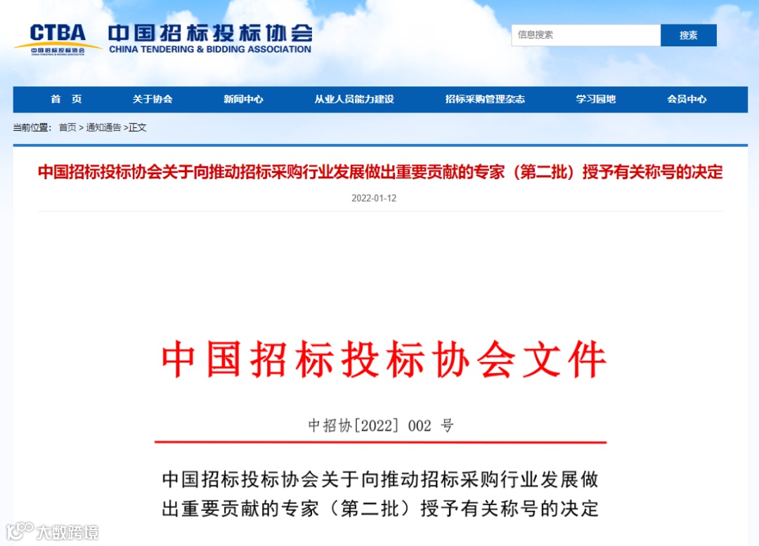 新年伊始,捷报传来。2022年1月12日,中国招标投标协会发布《关于向推动招标采购行业发展做出重要贡献的专家(第二批)授予有关称号的决定》,向行业内30名骨干专家授予“招标采购行业专家”荣誉称号,其中,国信集团5名专家获此殊荣。具体包括:国信集团副总裁王胜、国信招标集团股份有限公司副总经理高轩、北京国信创新科技股份有限公司副总裁包立贞、国信国际工程咨询集团股份有限公司PPP支持中心经理奇峰、国信集团退休专家汤全林。