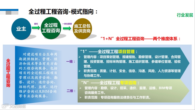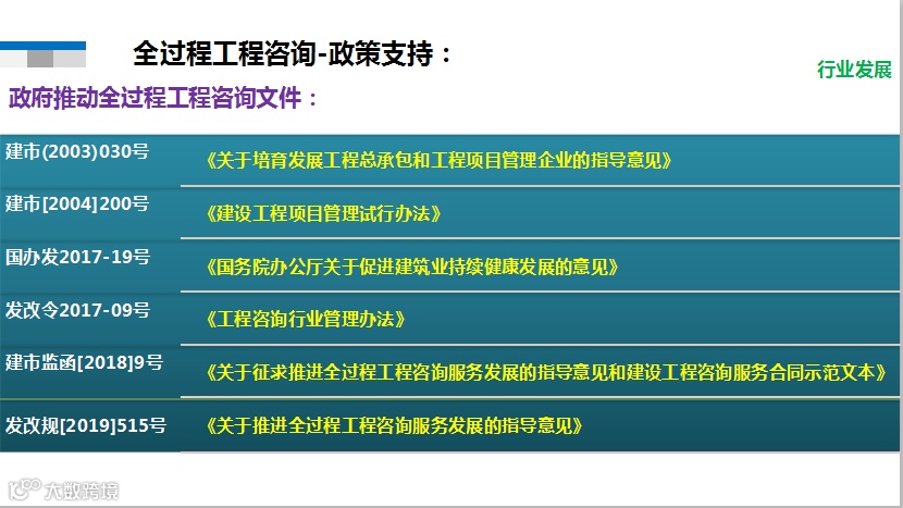 2017年2月起,随着《关于促进建筑业持续健康发展的意见》(国办发〔2017〕19号)、《关于推进全过程工程咨询服务发展的指导意见》(发改投资规〔2019〕515号)等文件的发布,政府部门不断出台推进全过程工程咨询服务的政策,并对开展全过程工程咨询业务应具备的资信资质和人员提出明确要求。