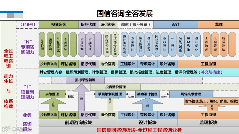 国信咨询作为国内知名综合性咨询服务企业之一,在投资咨询、招标代理、工程设计、工程监理、工程造价、项目管理等咨询服务领域已深耕细作多年。早在2018年始,国信咨询就对全过程工程咨询业务的发展做出了整体规划,至今已经形成了具有国信咨询特色的全过程工程咨询业务体系。