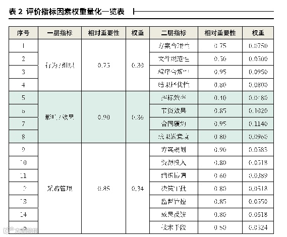 本文构建的评价指标体系包含二层,由于具体的招标采购项目存在行业和项目特性的差异,因此,每个评价指标对招标采购效果的影响程度需要根据行业和项目特性来进行具体分析和权重量化。本文对评价指标权重量化采用的是专家经验法,并建立了指标权重量化模型,通过专家根据每个评价指标对招标采购活动实施效果影响的相对重要性进行权数赋值,再根据量化模型计算得出每一个评价指标的权重。