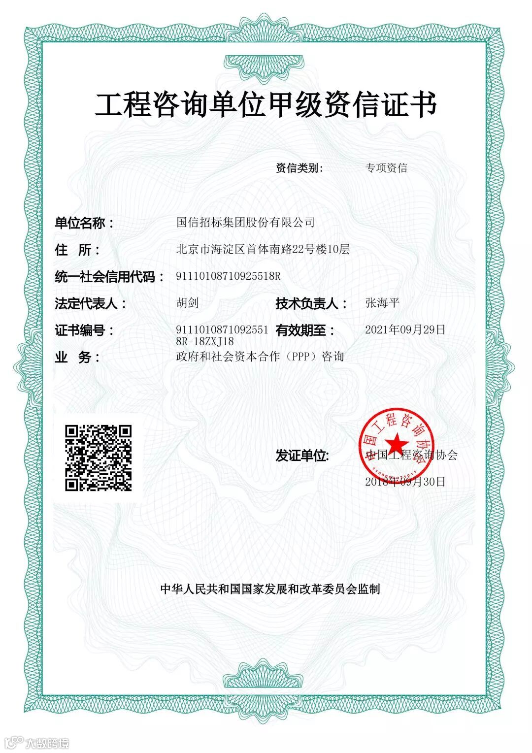 PPP咨询甲级专项资信证书