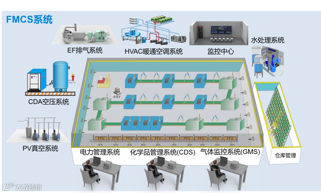 FMCS(Facilities Management Control System)是工业级的控制系统,监视并控制着生产的各子系统,包含:洁净室、暖通空调、排气系统、空压系统、真空系统、纯水系统、废水处理系统、中温水系统、气体监控系统、化学品供应、电力系统等。