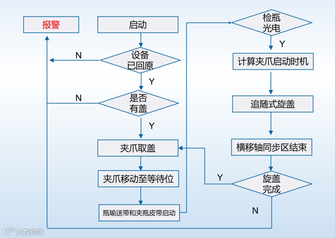 旋盖完成后,夹爪回到取盖位置取盖,再至等待位等待来瓶旋盖,依次循环。