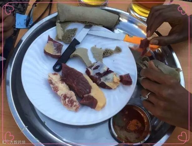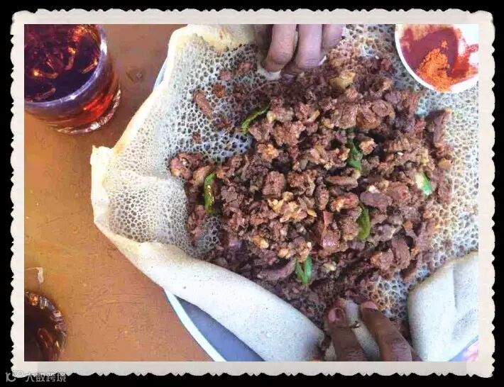 在埃塞俄比亚,有一种人人都喜欢吃的食物,当地人称为“C嘎”,当端上餐桌你会惊讶发现,这就是生牛肉。当地人很喜欢吃生牛肉,通常店里会将整头牛挂在钩上,他们用刀将牛肉割成小块然后用手抓着蘸酱吃。这鲜血淋淋的生牛肉,甚至在他们的国宴上也会出现。