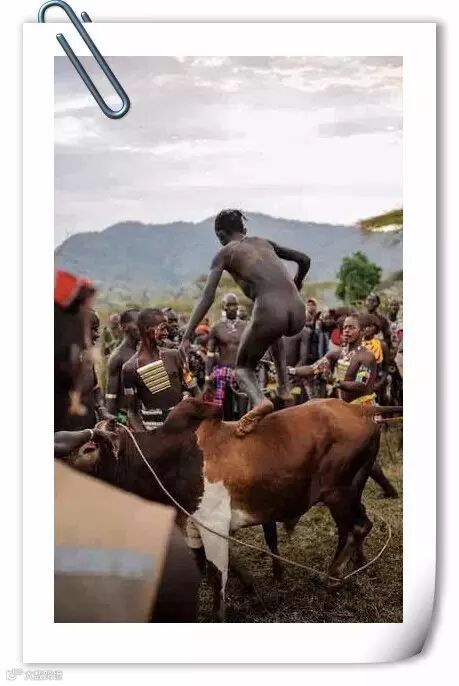 和唇盘族同时生活在埃塞俄比亚的南部的奥姆河谷的哈莫族部落,千百年来一直延续着奇特的成人仪式——跳牛。跳牛仪式上,只有成功跃过牛背4次的男孩才可升级为男人,从此可以娶妻生子。
