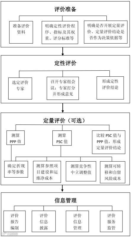 国际上对物有所值的评价分为事前评价和事后评价,事前评价是为了决定是否采用PPP,事后评价是为了检验PPP是否实现了物有所值。我国的物有所值评价主要集中在事前评价,根据财政部《政府和社会资本合作项目物有所值评价指引(试行)》财金[2015]167号,我国物有所值评价工作的流程主要包括:评价准备、定性评价、定量评价和信息管理。