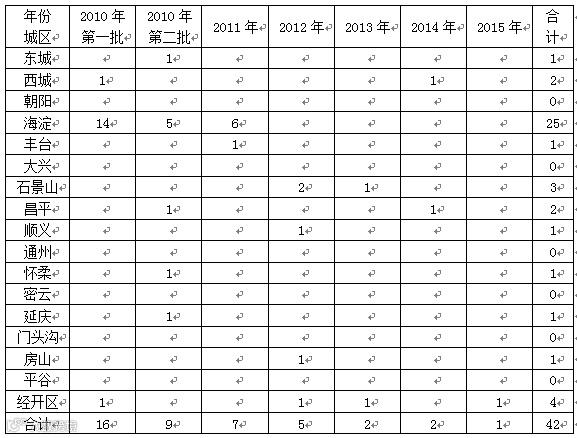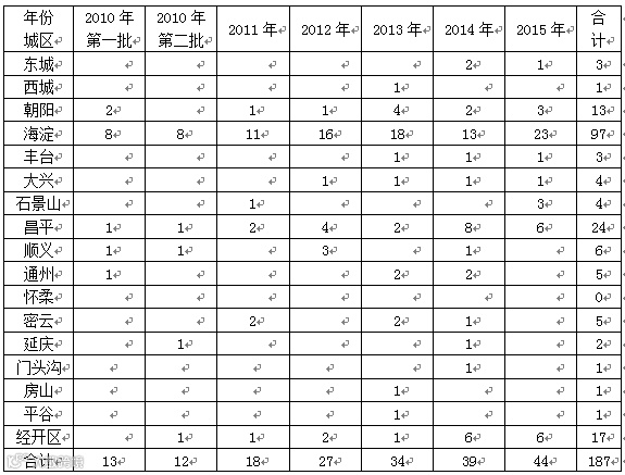 表3 2010-2015年北京工程实验室各城区分布(单位:家)