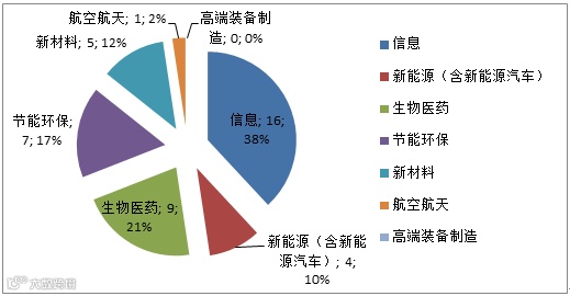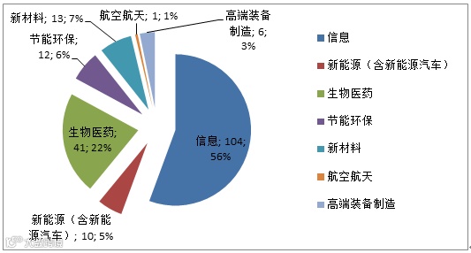 截止2015年,在187家市级工程实验室中,信息类104家,占总数量的56%;其次是生物医药41家,新材料13家,节能环保12家,各领域具体分布比重如图6所示。