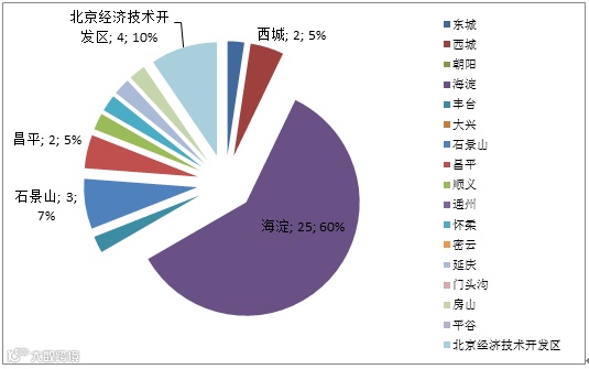 截止2015年,市级工程研究中心共计42家,各城区分布数量如表2、图1所示;其中海淀区25家,占市级工程研究中心总数量的60%,其它城区数量较少且分布较为平均,各城区分布比重如图2所示。