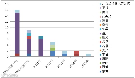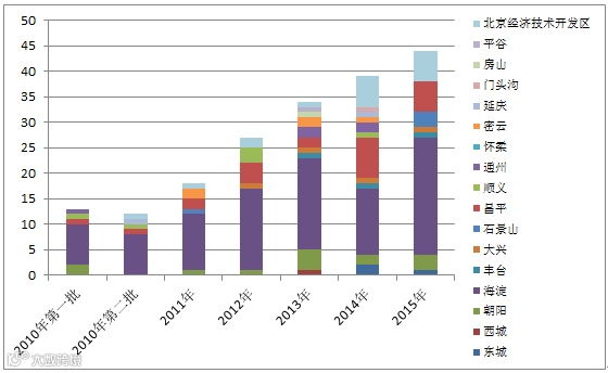 图3 2010-2015年度北京工程实验室各城区分布(单位:家)