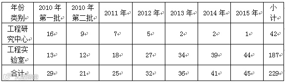 2010-2015年市级工程研究中心、工程实验室年度数量分布如表1所示。