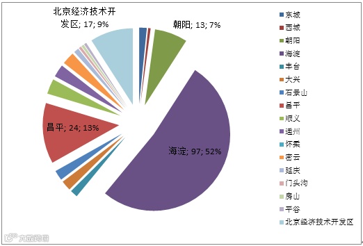 截止2015年,市级工程实验室共计187家,各城区分布数量如表3、图3所示。数量分布最多城区为海淀区97家,占北京市级工程实验室总数量的52%,分布较多城区有昌平区24家,经济技术开发区17家,朝阳区13家,具体各城区分布比重如图4所示。