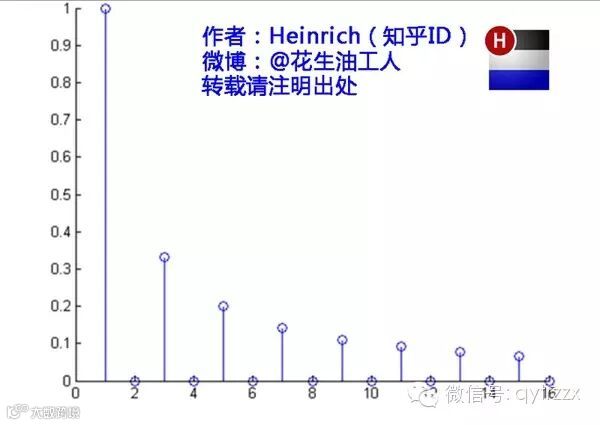 介绍完了频域的基本组成单元,我们就可以看一看一个矩形波,在频域里的另一个模样了: