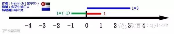 这里有一条数轴,在数轴上有一个红色的线段,它的长度是1。当它乘以3的时候,它的长度发生了变化,变成了蓝色的线段,而当它乘以-1的时候,就变成了绿色的线段,或者说线段在数轴上围绕原点旋转了180度。