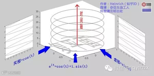 欧拉公式所描绘的,是一个随着时间变化,在复平面上做圆周运动的点,随着时间的改变,在时间轴上就成了一条螺旋线。如果只看它的实数部分,也就是螺旋线在左侧的投影,就是一个最基础的余弦函数。而右侧的投影则是一个正弦函数。